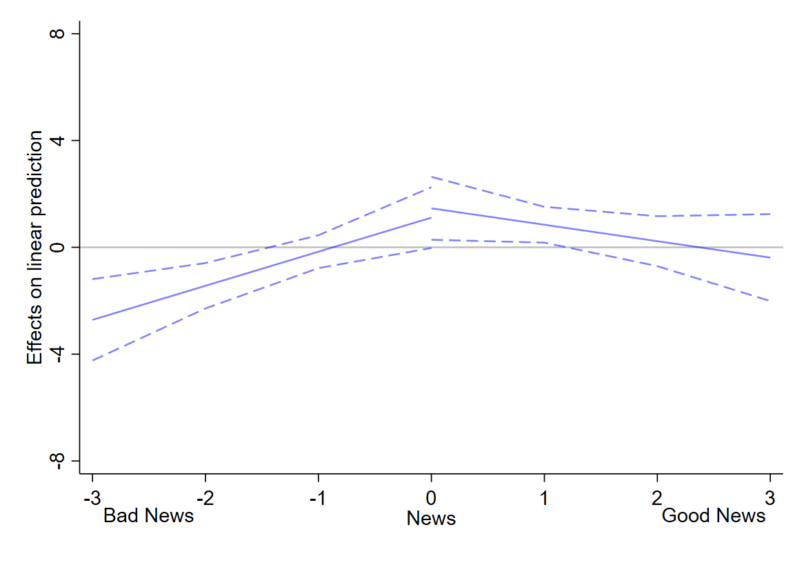 Image: people reduces incumbent mayors' support (y-axis) when we reveal they receive bad news regarding their performance (x-axis, left), but do not increase it when we reveal good news.