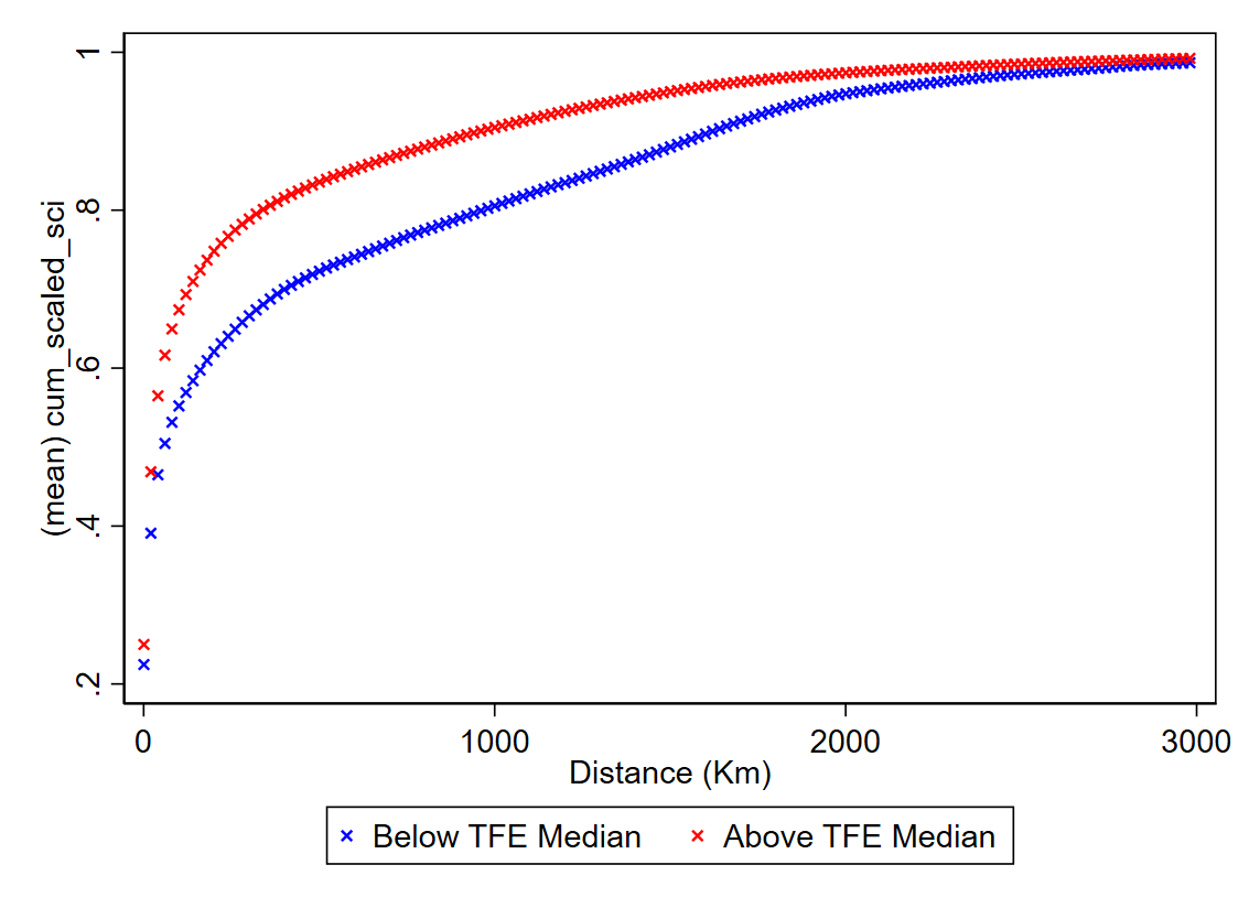 Image: People in more individualistic counties (red crosses) have their friends geographically closer: the same share of friends (y-axis) is in average located at a shorter distance (x-axis).