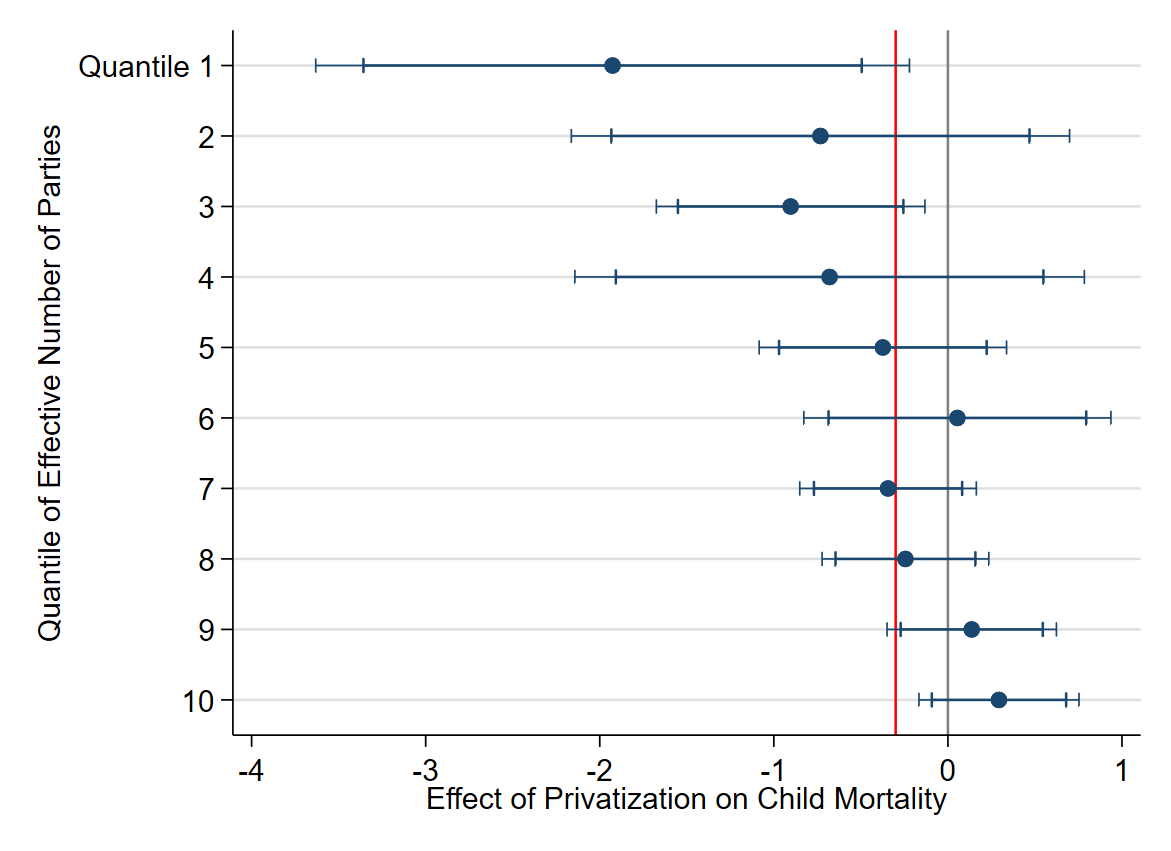 Image: The estimated reduction in Child Mortality (x-axis), by quantile of Political Competition (y-axis): Privatization improves child mortality when competition is low, but not when competition is high.