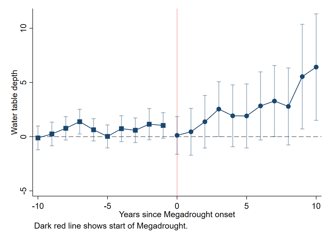 Climate change is expected to increase the frequency and intensity of droughts world- wide, potentially amplifying extant problems of water overuse. This paper exploits intra-country variation in water governance institutions, combined with an unexpected 14-year drought, to examine how institutions shape short- and long-run adaptation to growing water scarcity in irrigated agriculture. I develop a dynamic model of groundwater use with heterogeneous farmers and recurrent droughts to study the evolution of commons dilemmas. The model predicts sharper and more regressive responses to climate shocks in the presence of effective governance. I test these predictions using a unique panel dataset covering more than 200,000 farms over nearly 20 years, supplemented with aquifer data and agricultural censuses. Crucially, some areas historically introduced “water boards” to govern local water usage, while others did not. Empirically, we find that irrigated farms governed by water boards are less vulnerable to drought shocks in the short run. Counties with water boards reduced irrigated area (particularly those of small, lower-income farmers) more than those without as the drought worsened . Finally, we estimate slower aquifer depletion in areas with water boards. Together, these results underscore the importance of strong institutions for enabling sustainable adaptation in the long run, while highlighting the trade-offs they entail in the short term.